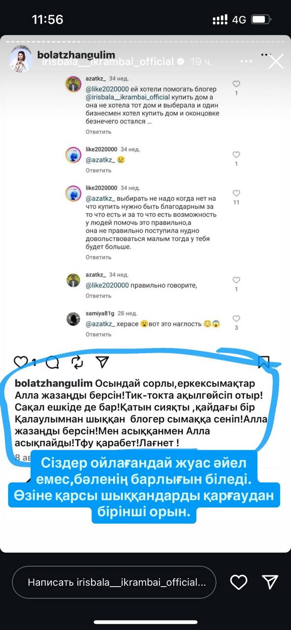 «Мына әйелді танитындар бар ма? Гүлім Болатжан деген осы. Әлемдегі жалғыз періште, жылдар бойы мені қаралап жүр. Осы қатынға ғана Ырысбала үй бермейді екен, Асар-Уме тұруға жарамсыз үй береді екен. Төрт баланы қайда тастаймын дейді. 4 баласының үлкені 11-сынып бітіріп жатыр екен! Көмек қажет деп халыққа алақан жайып жүргеніне 11 жыл бітеді. Бұл қатынның мұқтаждығы қашан аяқталады? Қол жаюды намыс емес, кәсіп қылып алған бұл әйел», — деді ашуға булыққан блогер.